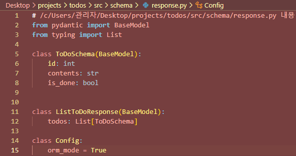 - get_todos API가 어떤 식으로 응답해야 하는지, 즉 schema를 정의해 주기 위한 response.py 파일 생성