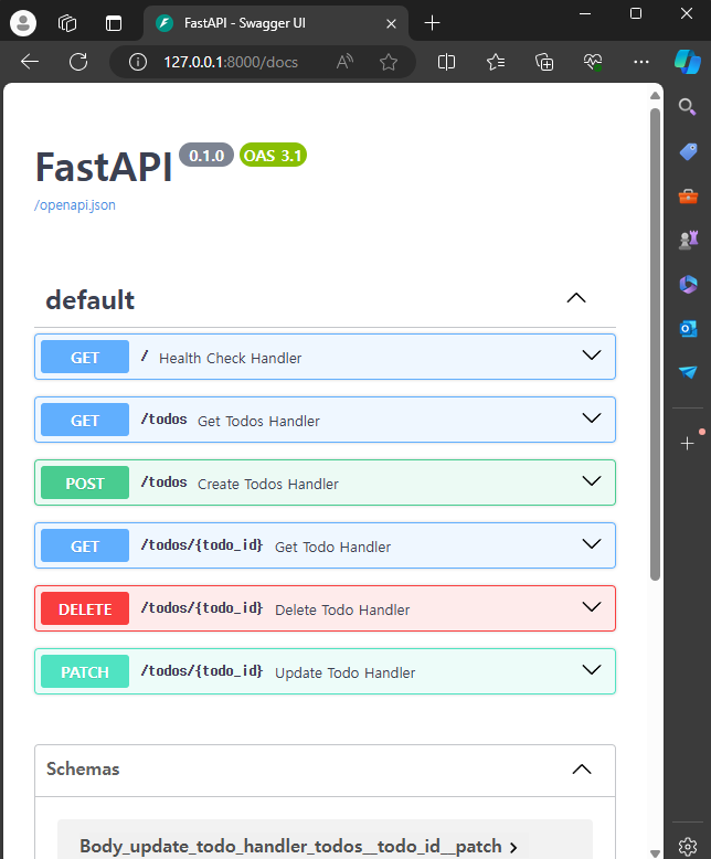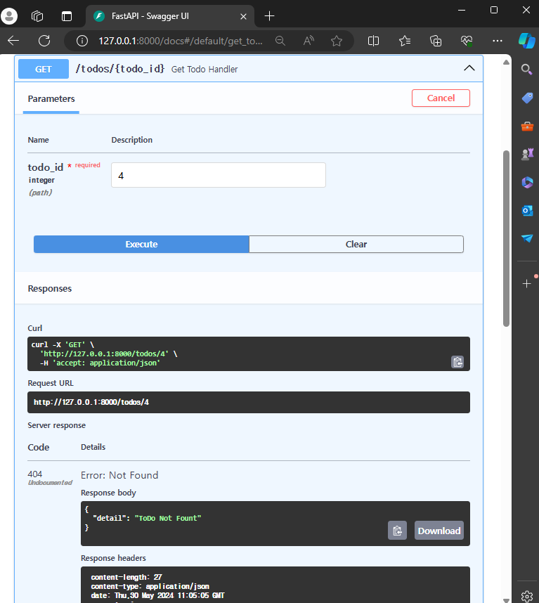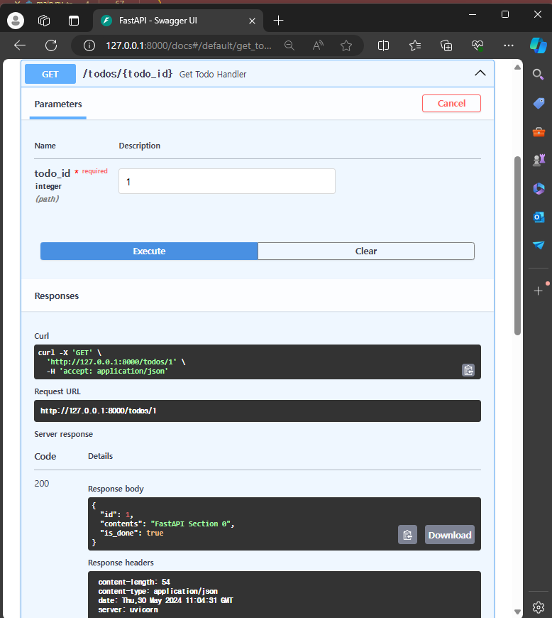 GET /todos/{todo_id} Get Todo Handler 클릭 > Try it out > Parameters 아래 todo_id 값에 1 입력 > Execute
