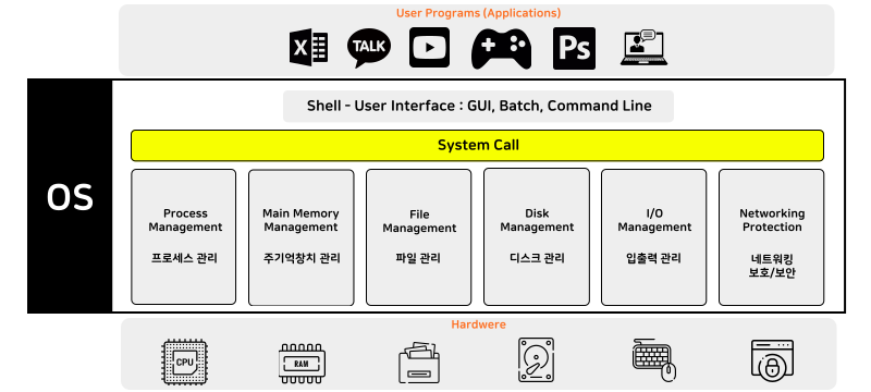 - 운영체제는 컴퓨터의 하드웨어 리소스를 관리함