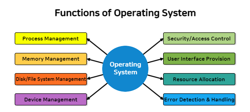 - 운영체제는 일련의 작업 순서를 정하고 중앙처리장치(CPU), 주기억장치, 주변장치 등의 여러 하드웨어 시스템에 이를 할당하는 일련의 매우 복잡한 명령으로서, 프로그램 실행은 물론 파일 접근, 응용 프로그램 구동, 모니터 및 메모리 저장장치 제어, 글자판 명령 해석과 같은 특별한 임무를 수행하도록 CPU에 지시함. 또한, 여러 사용자가 동시에 작업을 수행할 때에는 이른바 시분할 (time-sharing) 방식으로 작업의 우선순위를 정해 시간과 자원을 효율적으로 배분하며, 네트워크상에서는 다른 컴퓨터와 상호 작용하는 일을 제어하기도 함