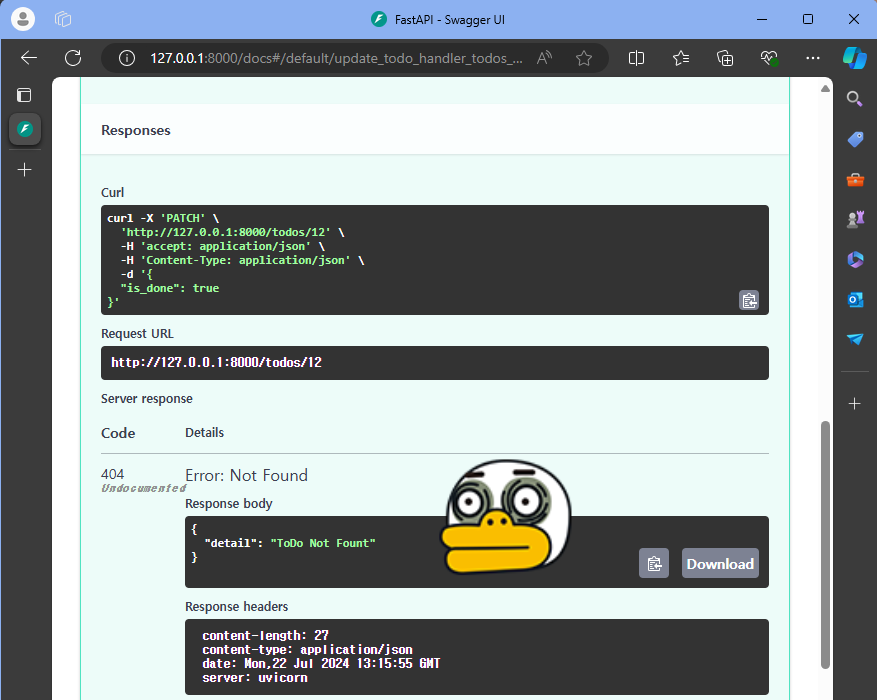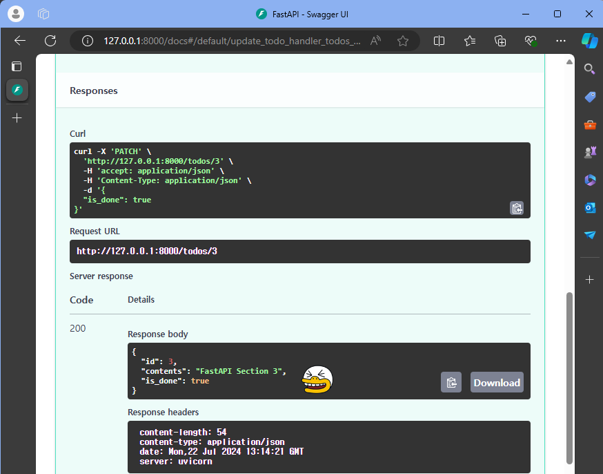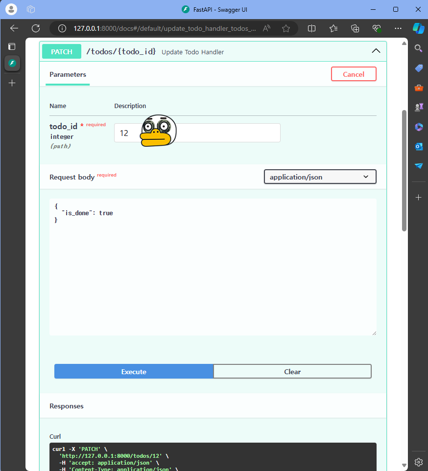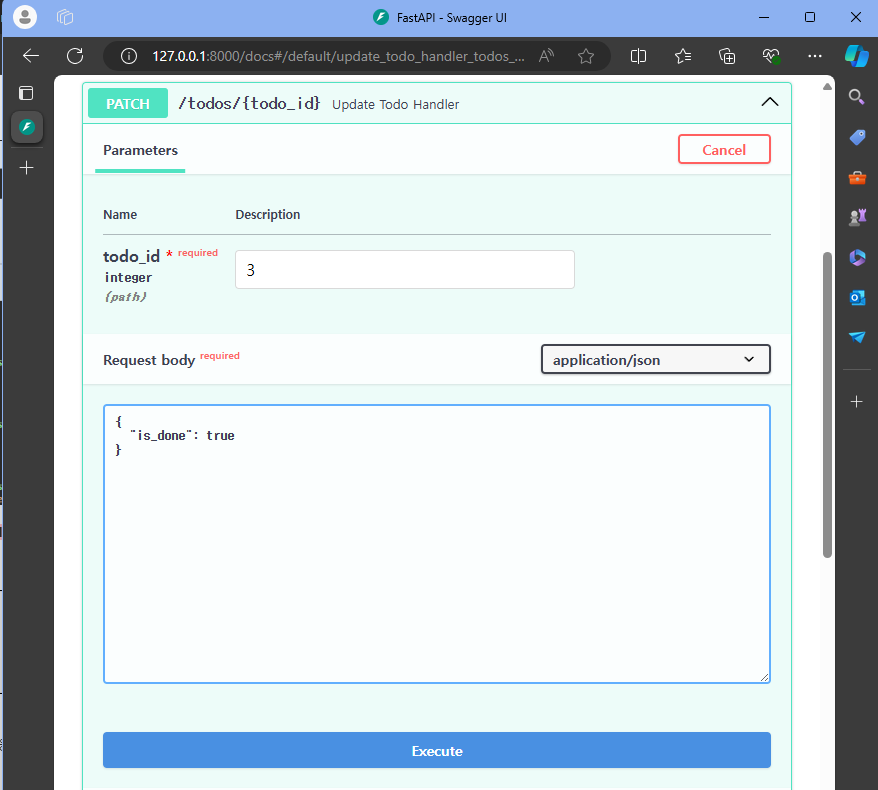 PATCH /todos/{todo_id} Update Todo Handler 클릭 > Parameters 아래 todo_id 값에 3 입력 > Request body 아래 다음을 입력
