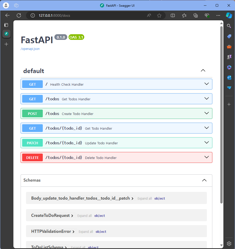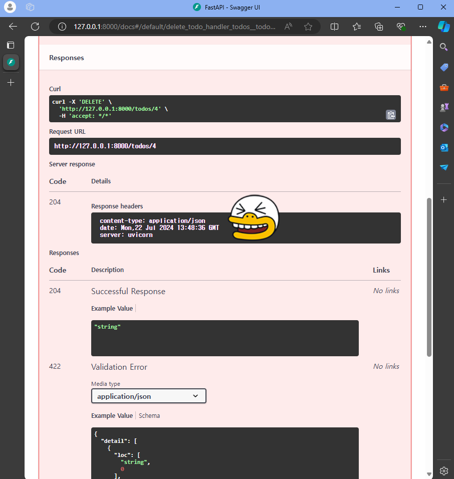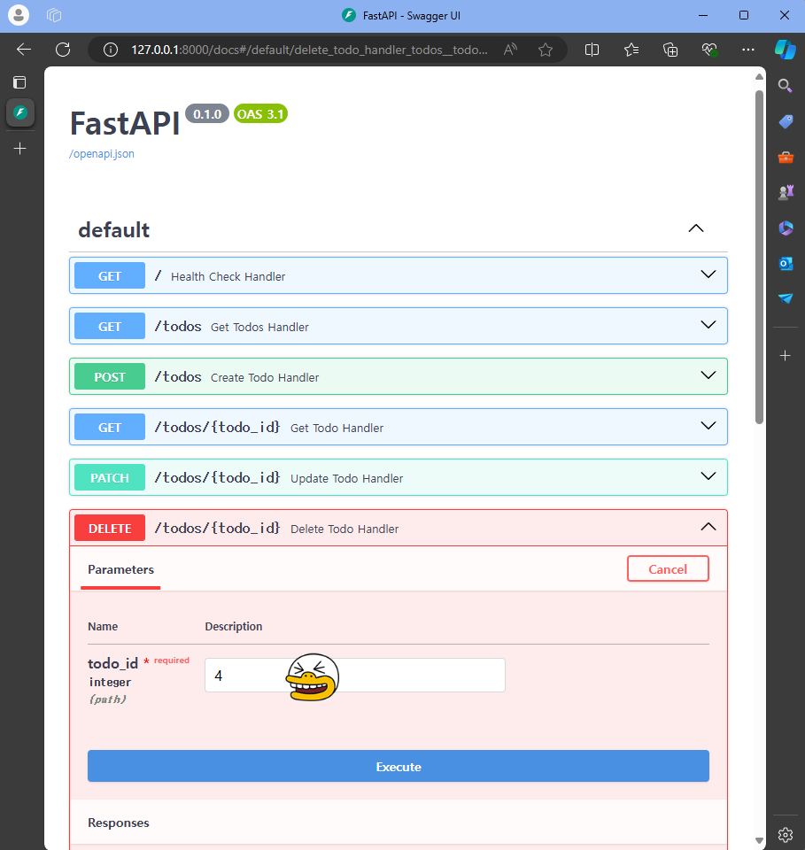 DELETE /todos/{todo_id} Delete Todo Handler클릭 > Try it Out > Parameters 아래 todo_id 값에 4 입력