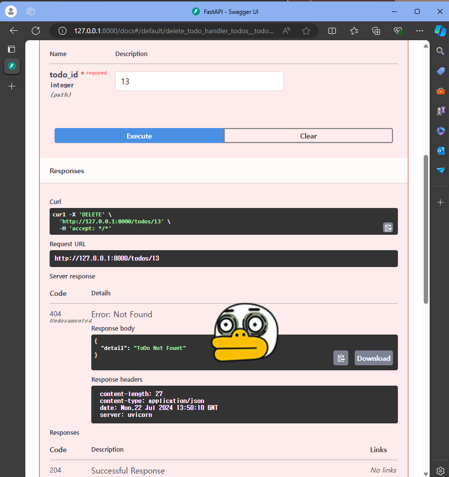 만약 존재하지 않는 ToDo를 todo_id값에 넣어 삭제하려고 할 경우 (예, id=13) 404 응답(에러 발생)이 뜰 것