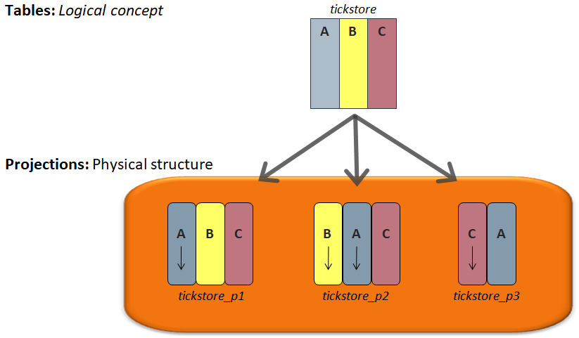 - Vertica의 테이블은 논리적인 구조를 정의 할 뿐 데이터를 저장하고 있지 않으며, 데이터를 저장하는 곳은 Projection이라는 물리적인 구조임