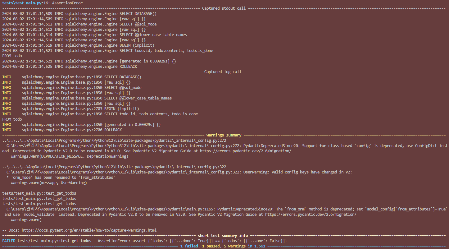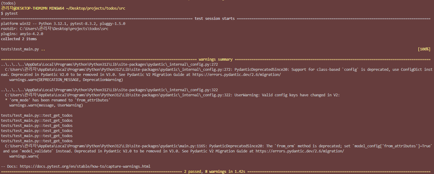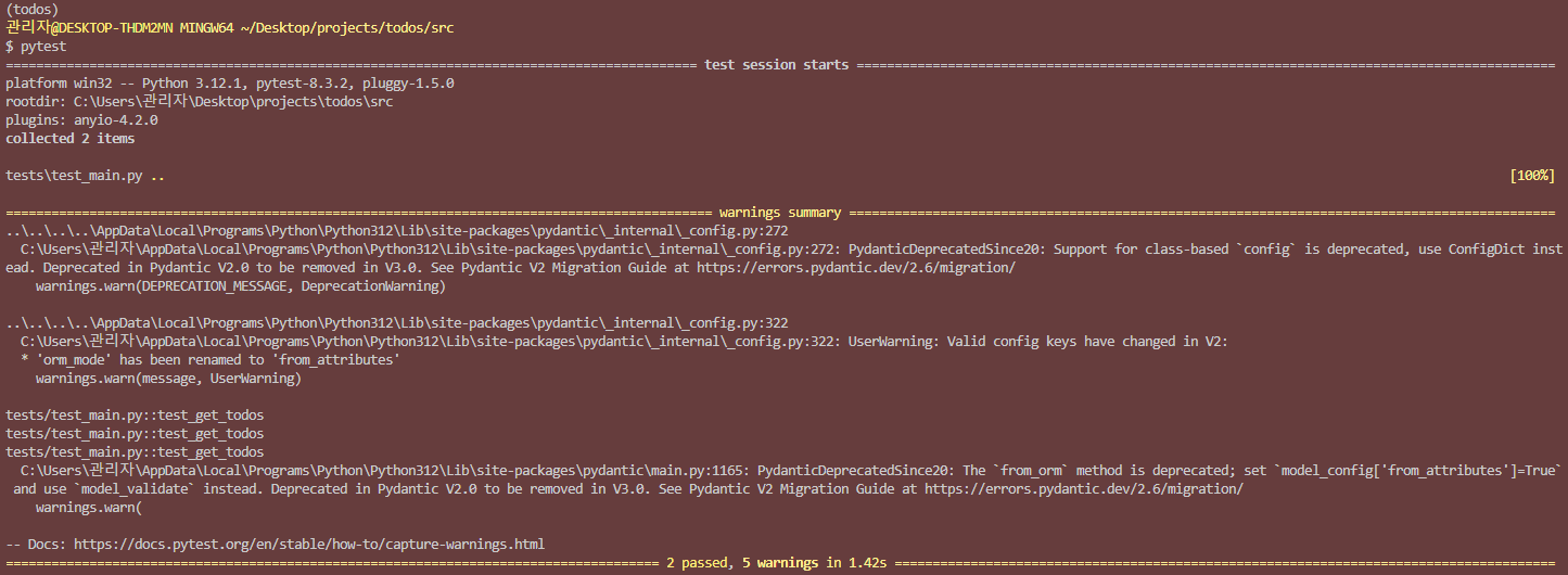 - 다음 '01 GET 전체조회 API에 테스트 코드 추가하기'에서 test_main.py에 테스트 코드를 작성 후 pytest 명령어로 검증하려 할 때 다음과 같은 warning이 출력됨