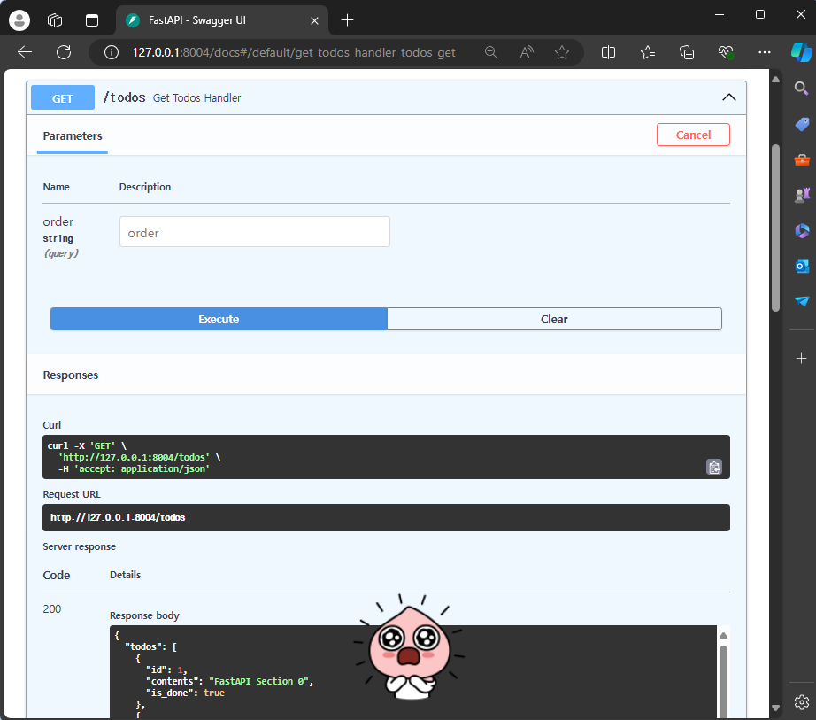 - 1 실습2 GET API ToDo 단일 조회: 2024.04.09 - [Web 개발/FAST API (인프런 강의 내용)] - 1 실습2 GET API 단일조회