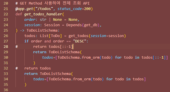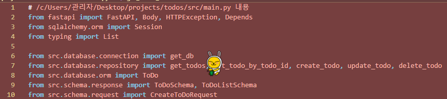main.py에 보면 get_todos_handler()의 반환값으로 Todo라는 값을 List로 반환해주도록 설정된 것 확인 (i.e., List[ToDo])