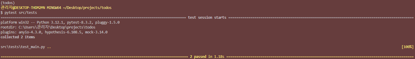 그리고 후에 $ pytest todos/src 이렇게 경로를 줘서 pytest를 실행했었는데도 에러남