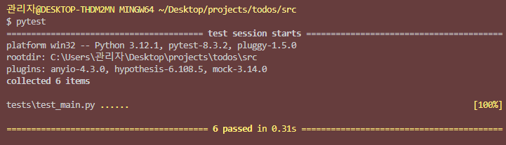 - src 디렉토리로 이동하여 $ pytest 실행하여 정상작동하는지 검증해보기