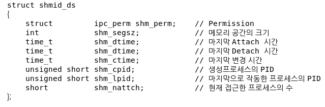 - 공유 메모리 정보들은 shmid_ds라는 구조체에 의해 관리되며 shm.h에 정의되어 있음