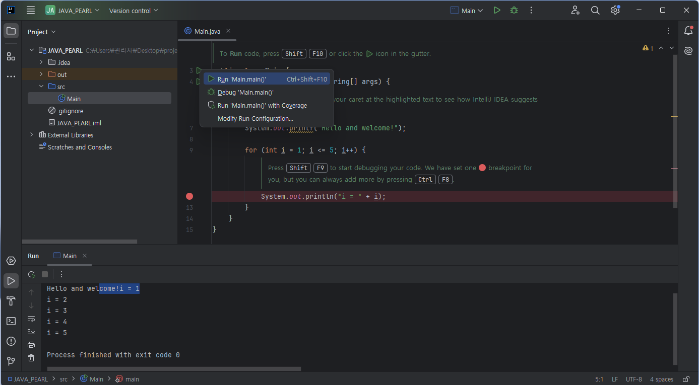 위쪽에 초록색 화살표 버튼 클릭 > Run 'Main.main()' 버튼 클릭 시 프로그램 실행됨