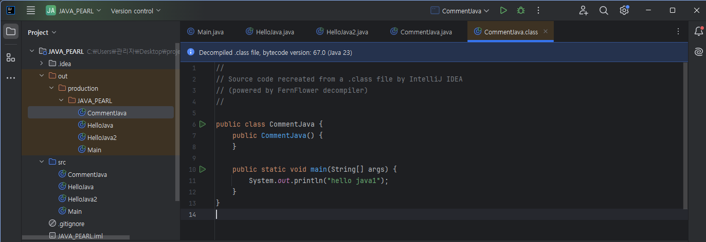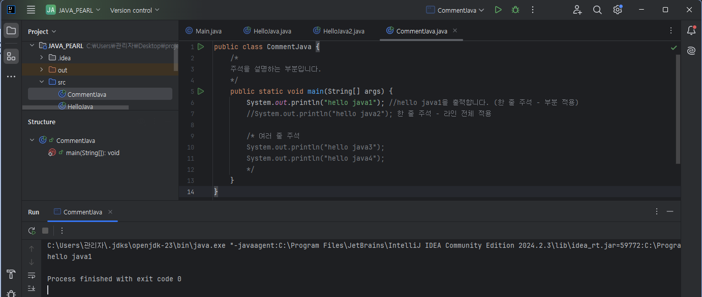System.out.println("hello java1"); //hello java1을 출력합니다. (한 줄 주석 - 부분 적용)