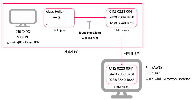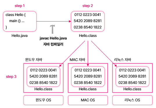 자바 개발자는 특정 OS에 맞추어 개발을 하지 않아도 됨. 자바 개발자는 자바에 맞추어 개발하면 됨. OS 호환성 문제는 자바가 해결함. Hello.class와 같이 컴파일된 자바 파일은 모든 자바 환경에서 실행 가능