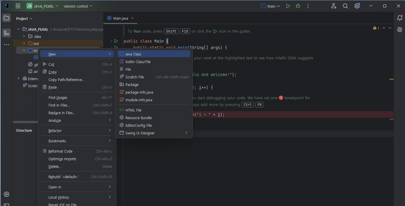 2)ItelliJ 메인 화면