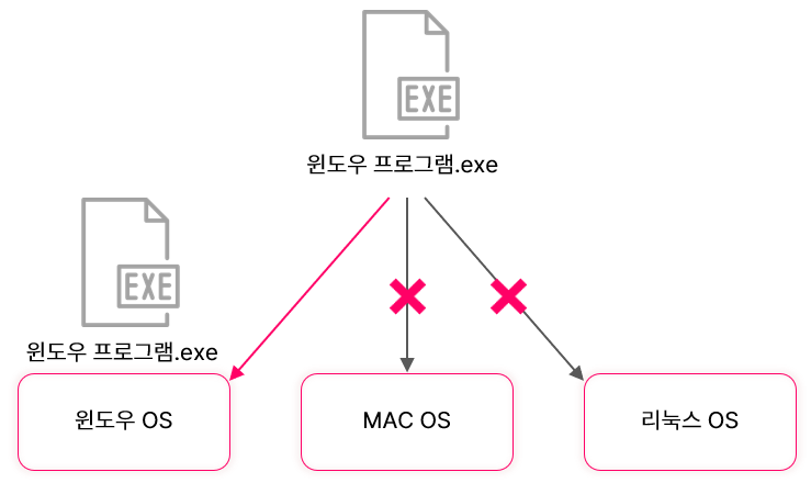 예) 윈도우 프로그램을 실행하면 MAC이나 리눅스에서 작동하지 않음.