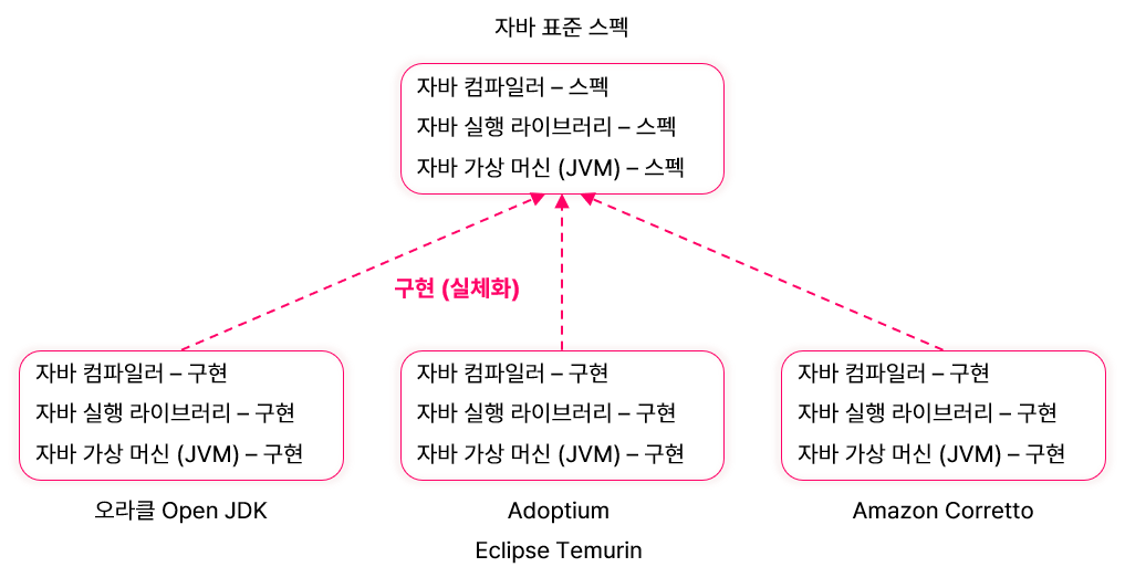 자바 구현들은 모두 표준 스펙에 맞도록 개발되어 있음. 따라서 오라클 Open JDK를 사용하다가 Amazon Corretto 자바로 변경해도 대부분 문제 없이 동작함 (학습 단계에서는 어떤 자바를 사용하든 크게 상관 없음)