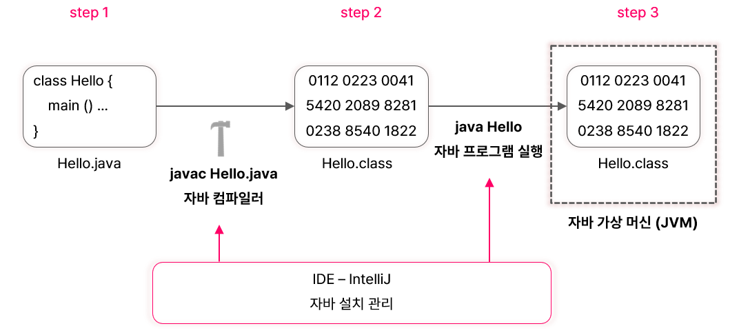 step 1. Hello.java와 같은 자바 소스 코드를 개발자가 작성함