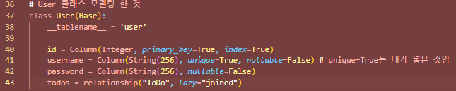 - 앞서 실습에서 회원가입을 위한 user 테이블에 관하여, (orm.py 파일) user 테이블의 todos라는 속성을 연결해 줄 때 relationship() 함수의 lazy 키워드에 "joined"옵션을 줘서user가 조회될 때 자동으로 todo 테이블의 데이터가 함께 조회되도록 설정함
