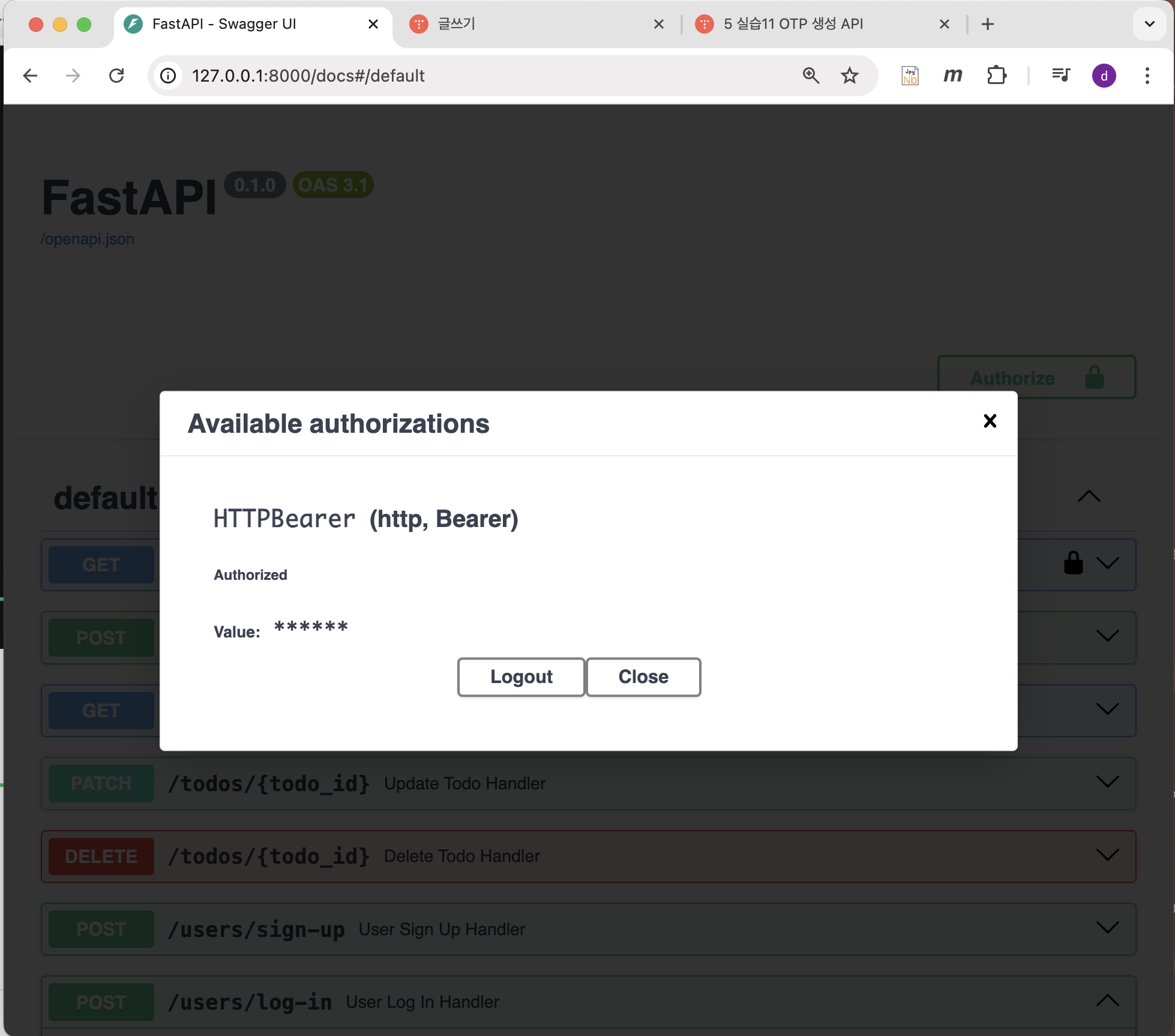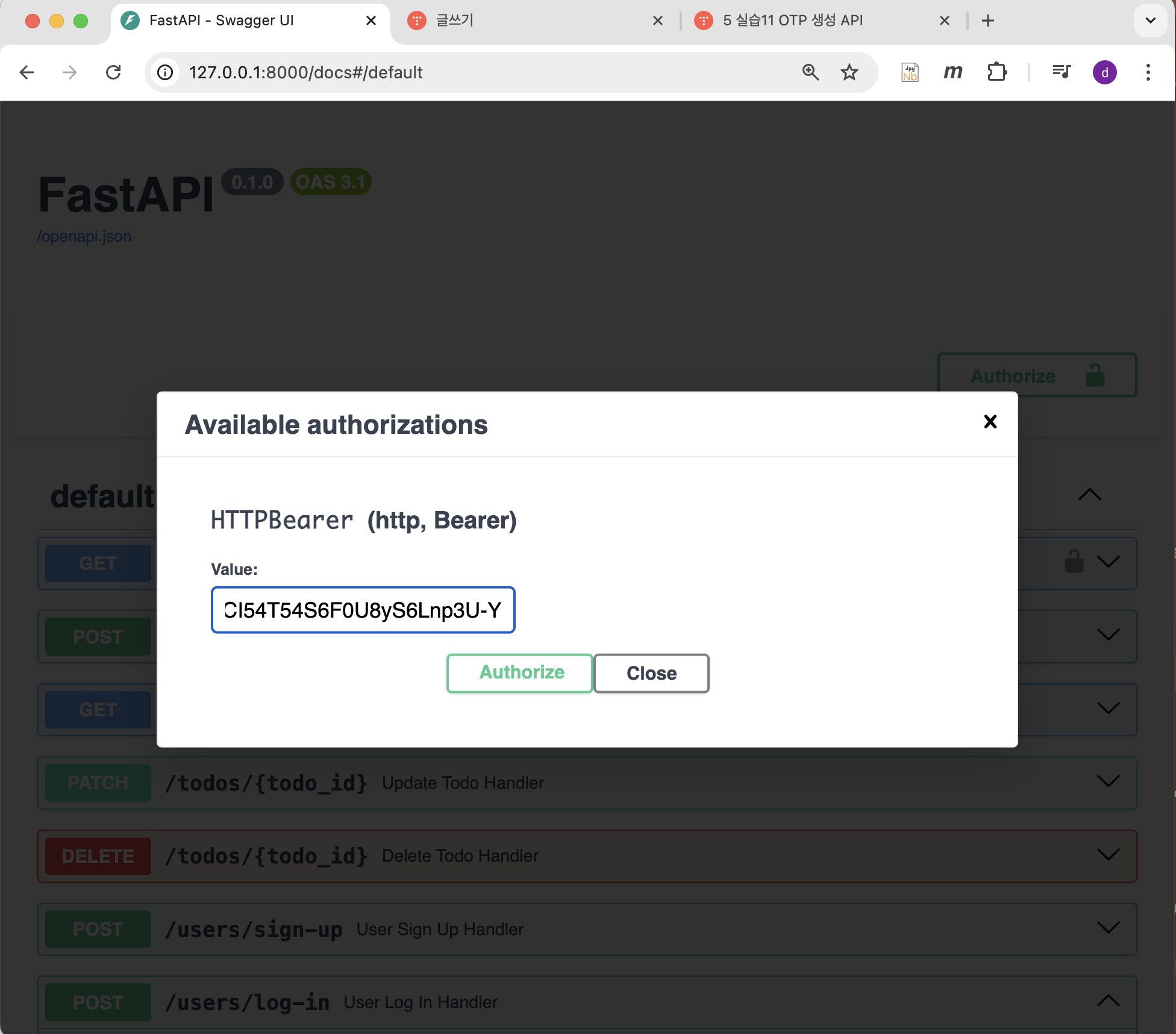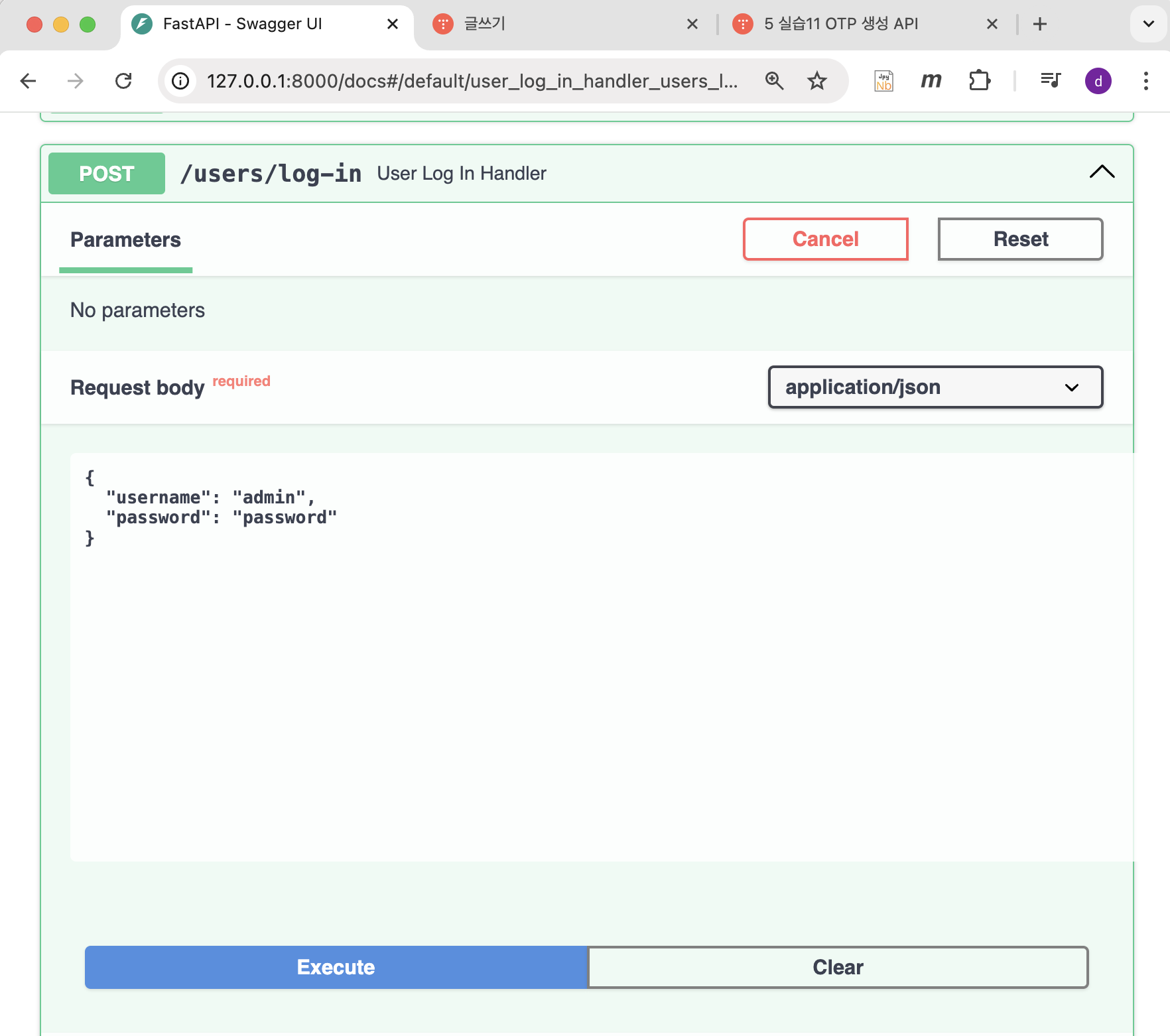 - 5 실습8 로그인 API 테스트: 2024.11.25 - [Web 개발/FAST API (인프런 강의 내용)] - 5 실습8 로그인 API 테스트