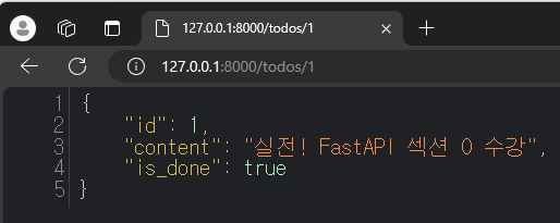 - 브라우저에 http://127.0.0.1:8000/todos/1 입력 시 → 허용된 값, 존재하는 키 값