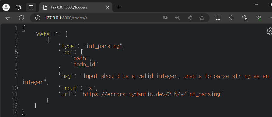 - 브라우저에 http://127.0.0.1:8000/todos/s 입력 시 → 허용되지 않는 값 (int가 아님), 존재하지 않는 키 값