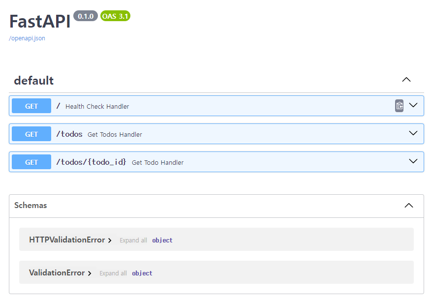 - @ 뒤에 있는 app (앞서 app=FastAPI() 선언하여 가능)이라는 FastAPI 서버에 "/todos/{todo_id}" path로 개인 요청을 보내게 되면 아래에 있는 get_todo_handler() 함수가 실행되어서 해당 API 요청을 처리할 것
