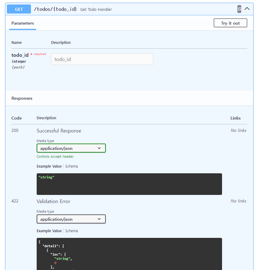 - Try it out 버튼 클릭 수 todo_id 값에 원하는 값들을 넣어서 Execute 클릭 시 출력값 확인 가능