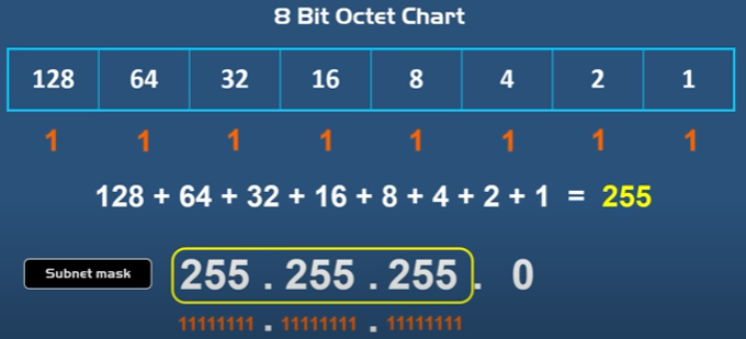 | /24 | 255.255.255.0 | 0.0.0.255 | 11111111 11111111 11111111 00000000 | 256 | 254 |