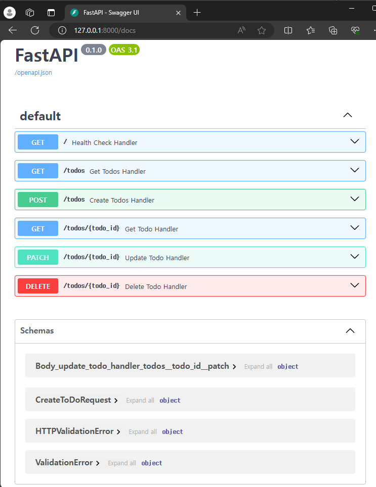 브라우저에 http://127.0.0.1:8000/docs 입력 또는 새로고침 시
