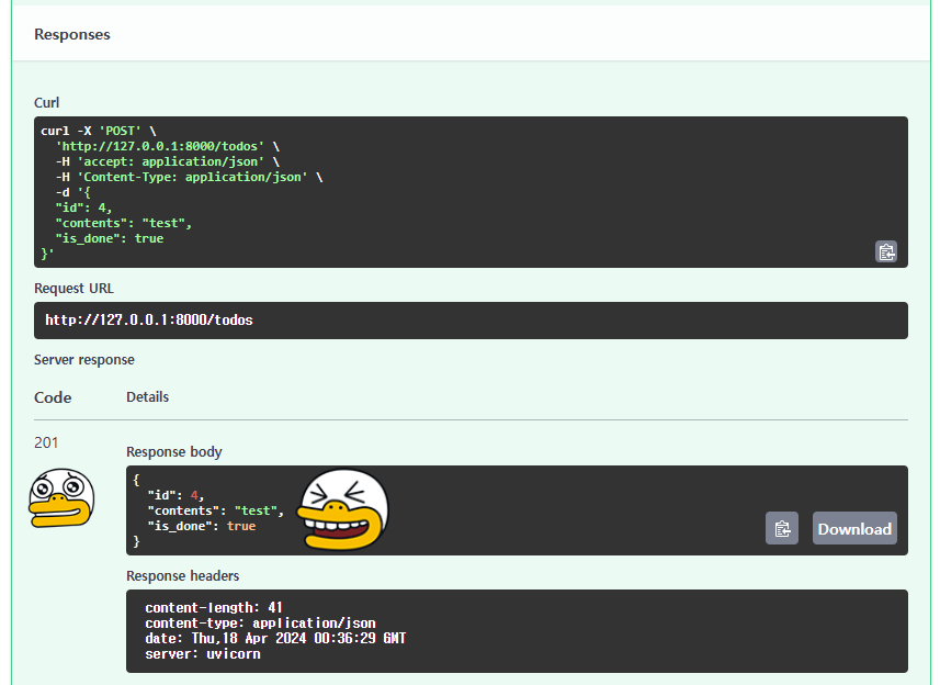 - 1 실습3 POST API ToDo 생성: 2024.04.15 - [Web 개발/FAST API (인프런 강의 내용)] - 1 실습3 POST API todo 생성