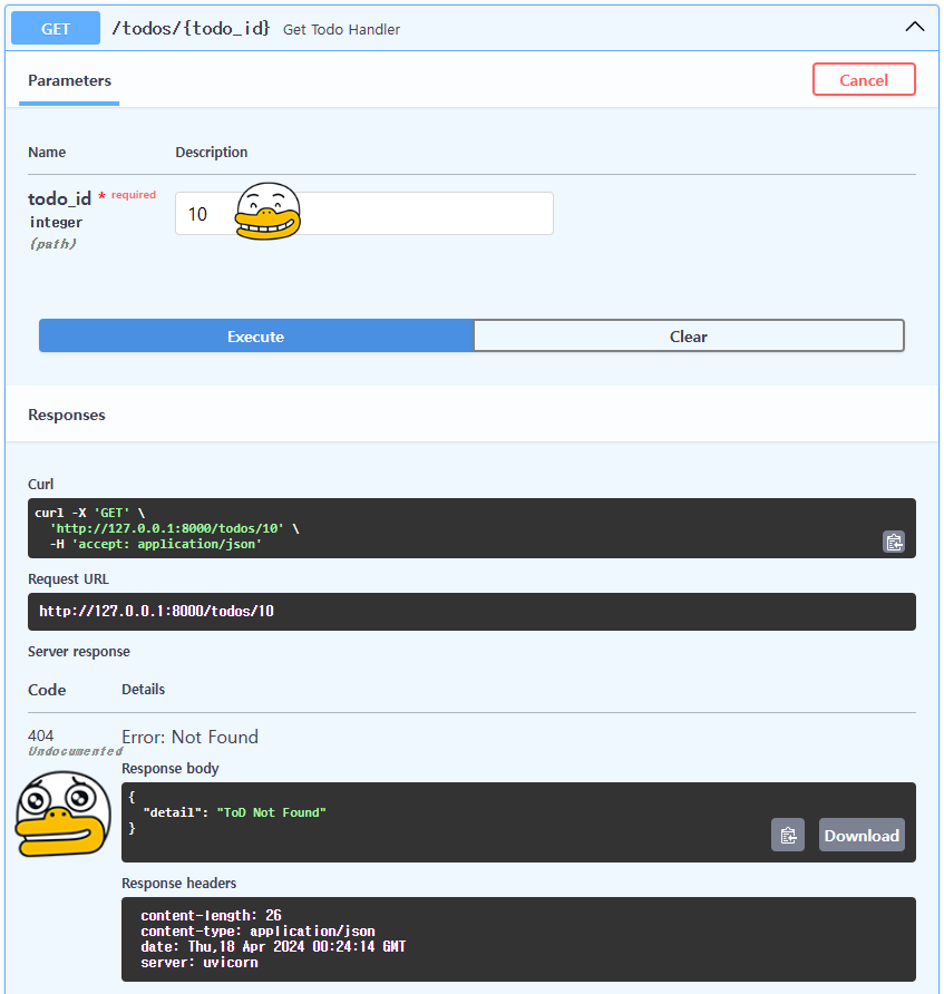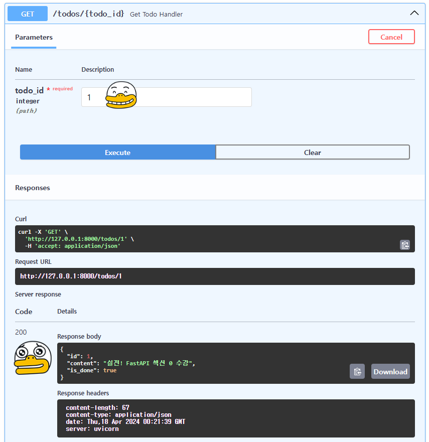 - Parameters의 todo_id에 3 입력 (존재하는 값) > Execute 클릭 시