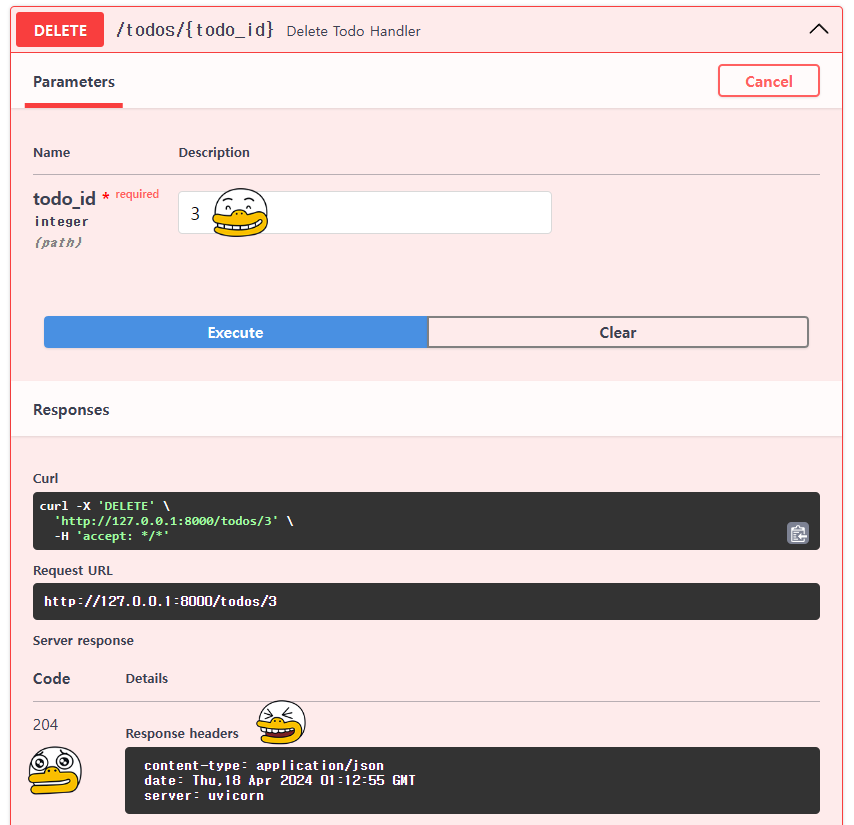 - DELETE /todos/{todo_id} Delete Todo Handler (todo 삭제) 클릭 > Try it out 클릭