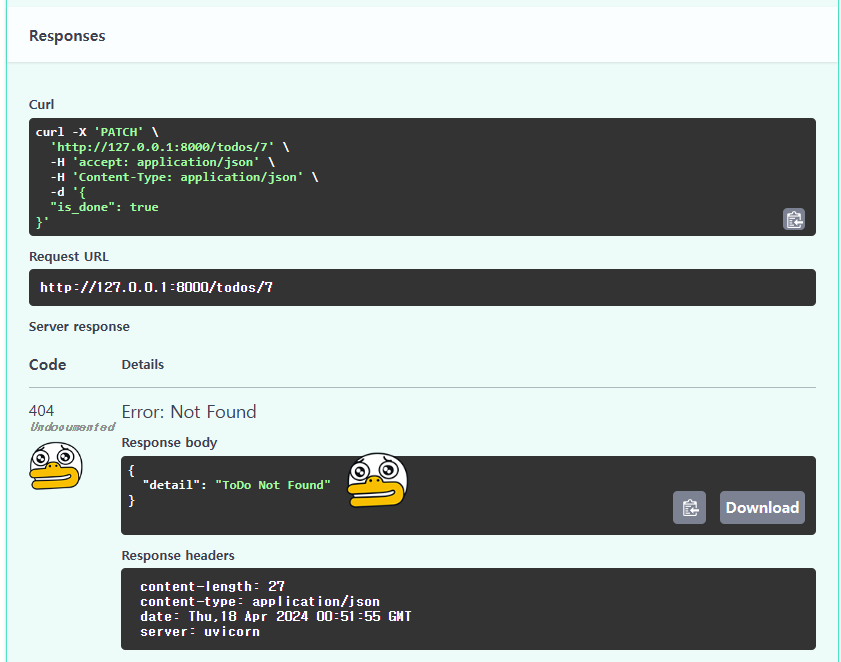 - Response body에서 'detail'로 'ToDo Not Found'가 출력되는 것 확인